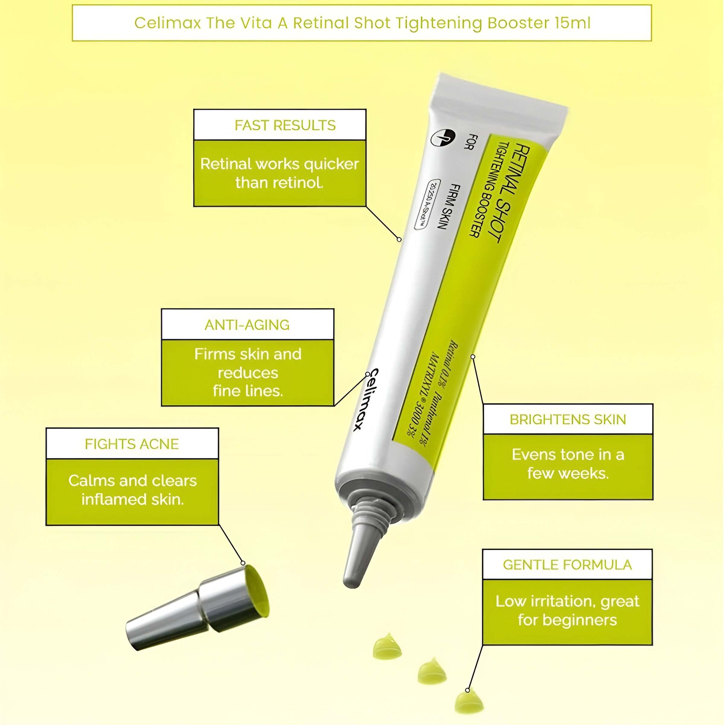 A retinal booster infused with 0.1% retinal, the advanced form of retinol, combined with A-Shotâ„¢, designed to directly penetrate pores and enhance absorption, delivers retinal deep into the skin to target wrinkles and enlarged pores, promoting smoother and firmer skin. It is highly recommended to pair with the Retinol Shot Serum